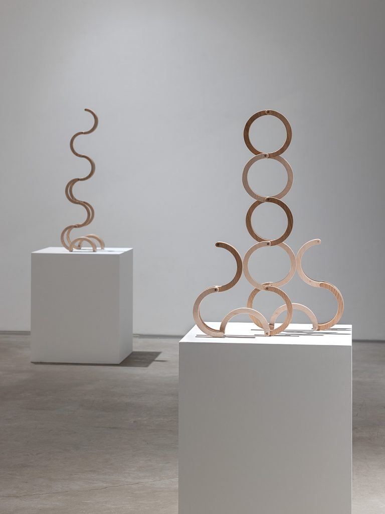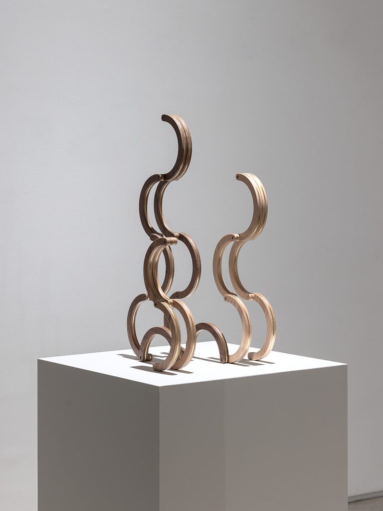 The exhibition space feels like an entrance into Buffalmacco’s painting: just as the fresco’s center presents a colossal demon entwined with serpents, Israel places at the heart of the show a monumental sculpture that echoes the contour of that figure. Around it are smaller sculptures made of laminated layers of metal (brass and stainless steel) and exposed solid wood. The combination of materials reinforces and repeats the sinuous line.