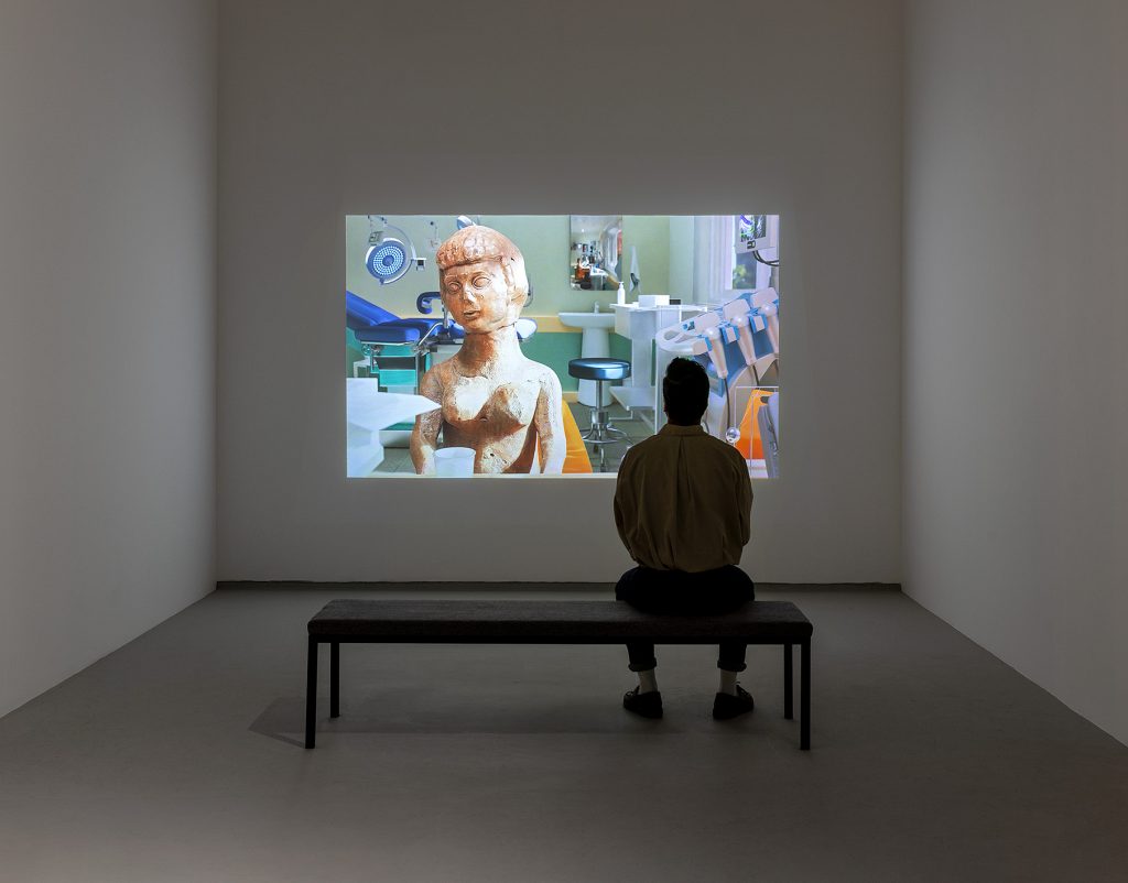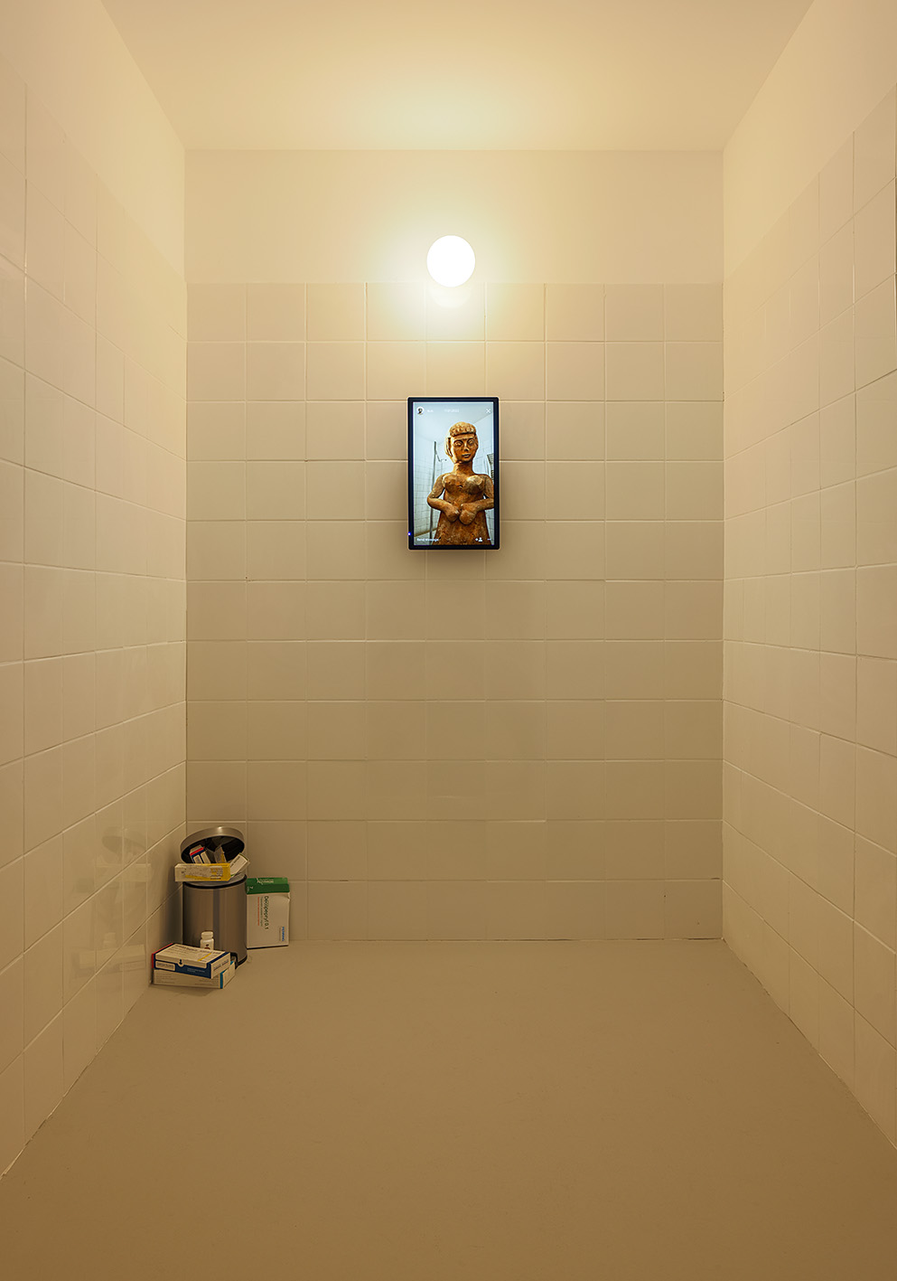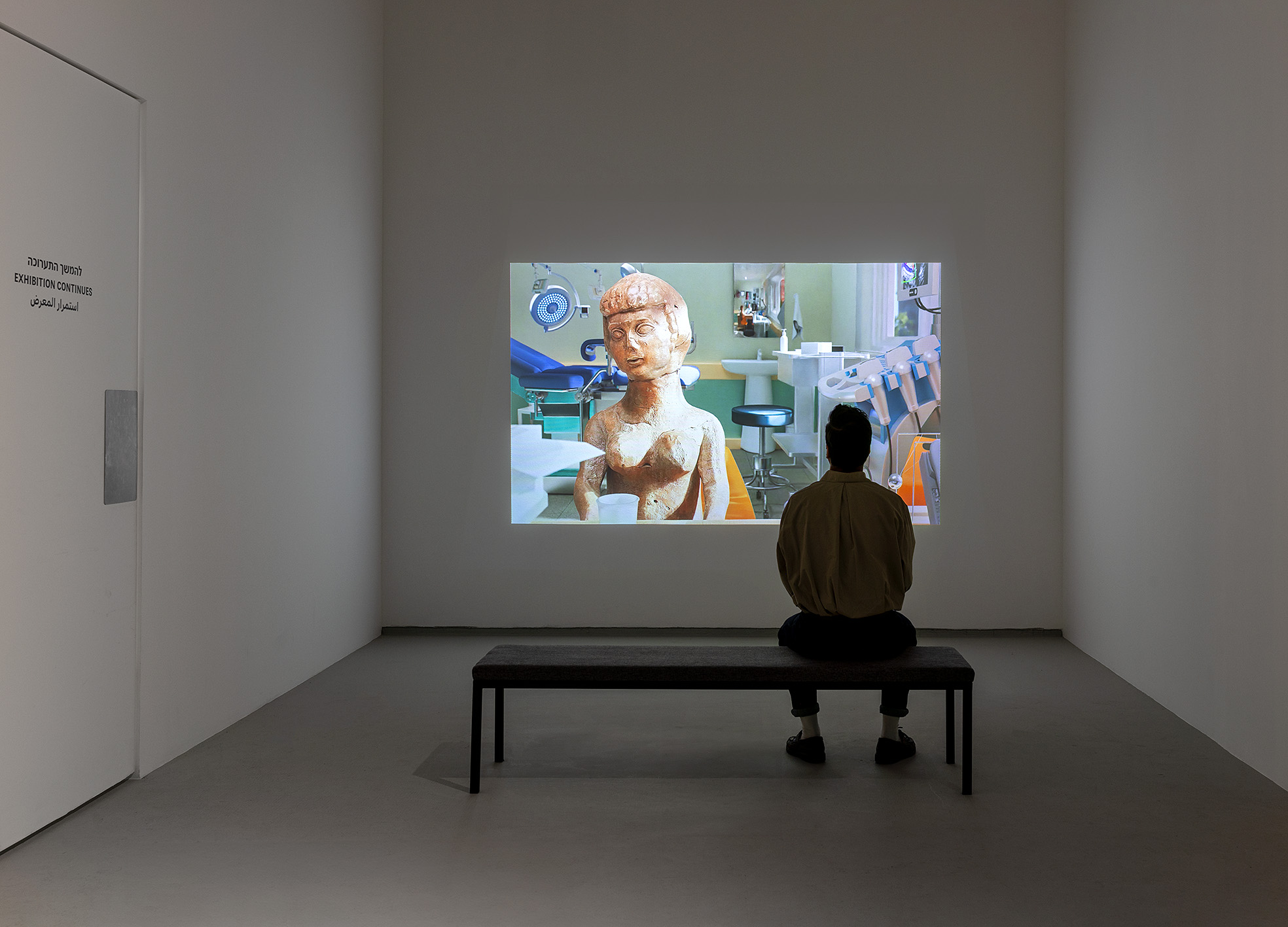 Patir decided that she would face the confusing new reality into which she had been thrust by documenting everything. Across a series of video works, she leads us through her journey: from the first patient interviews with her doctors; through the waiting room of a fertility clinic, where patients stare absently at their phones or at a television screen broadcasting live news; to the central work, (M)otherland, which weaves together two years of footage, including a routine of hormone injections and rounds of egg retrieval. The result is a funny, moving, at times painfully revealing diary. Patir uses ancient fertility figurines—small, enigmatic terracotta sculptures of women from the First Temple period—as avatars for herself and the women around her. Through motion capture technology, she animates the figurines as contemporary women grappling with their desires while confronting social norms and the expectations of others.
